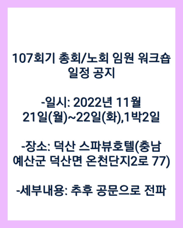 107회기 총회/노회 임원 워크숍 일정/장소 공지 최고관리자 0 1944 2022.10.21 08:05 107회기 총회/노회 임원 워크숍 일정/장소 공지 -일정: 2022년 11월 21일(월)~22일 (화). 1박2일 -장소: 덕산 스파뷰 호텔(충남 예산군 덕산면 온천단지2로 77) -세부내용: 추후 공문으로 전파 예정